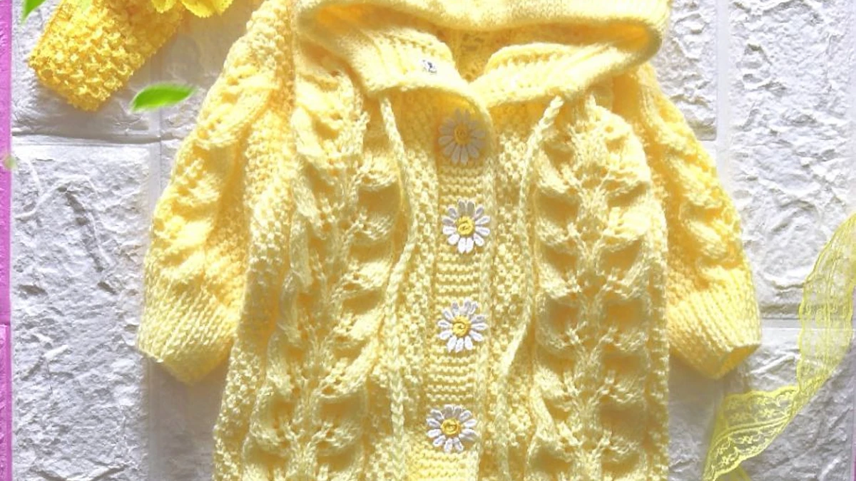 Этот милый вязаный комплект для малыша включает в себя очаровательный желтый комбинезон с капюшоном и повязку на голову. Комбинезон украшен узорами в виде листиков и милыми цветочными пуговицами, создавая солнечное и радостное настроение. Повязка на голову добавляет комплекту дополнительные очаровательные акценты.
