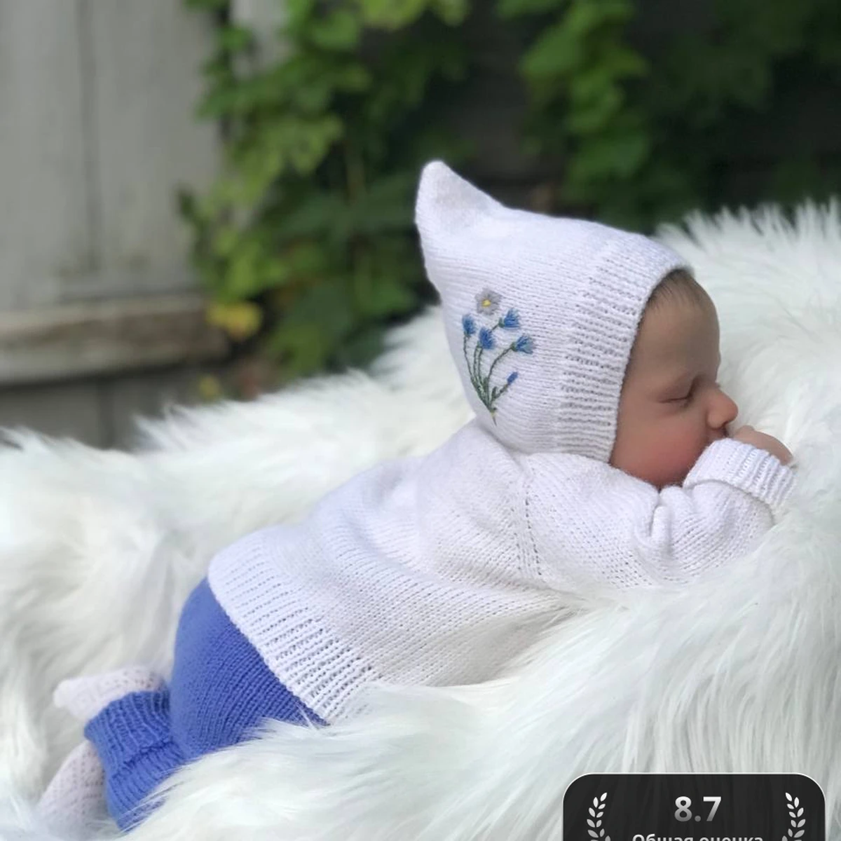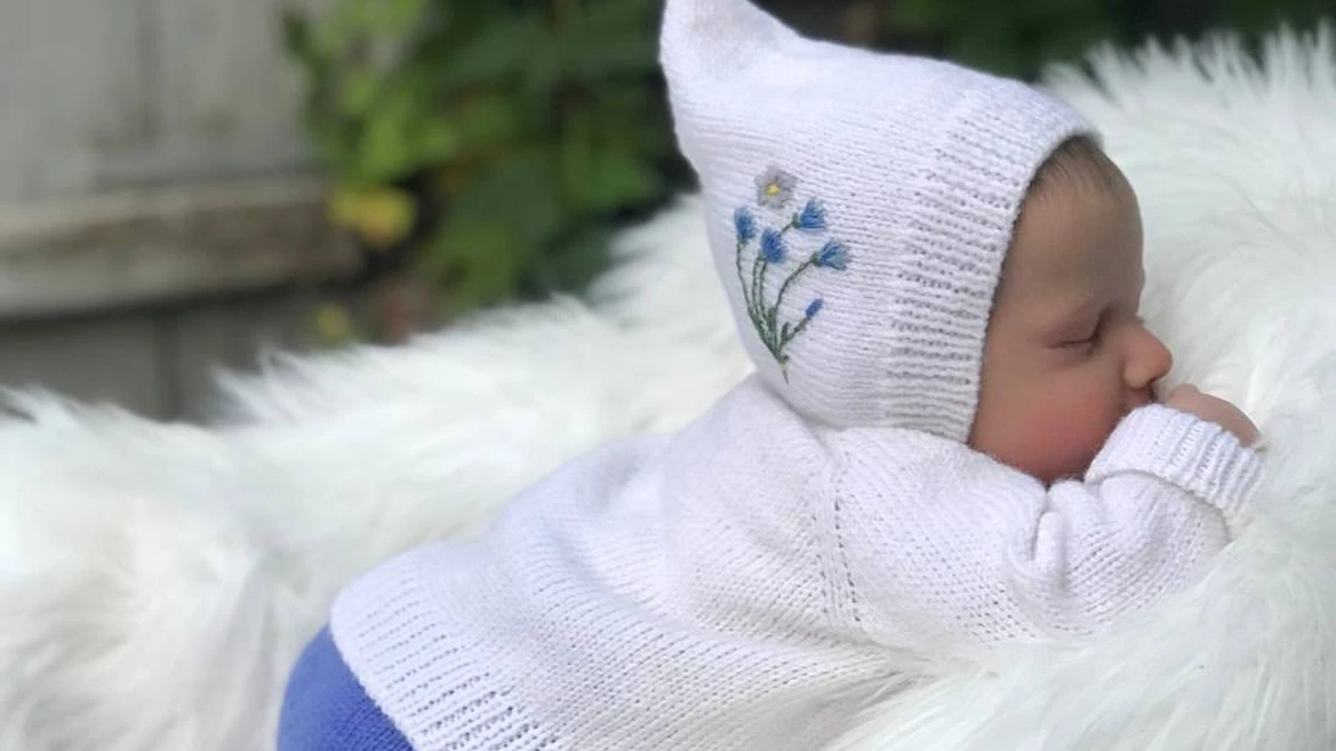 Нежнейший комплект для новорождённого: тонкий белоснежный чепчик с вышивкой незабудок, мягкий джемпер регланом сверху и лавандовые шортики-трусики с носочками в тон. Аккуратная лицевая гладь ложится ровно, подчёркивая деликатную текстуру пряжи, а изысканная ручная вышивка добавляет трогательный флёр полевых цветов. Пудрово-белая палитра в сочетании с небесно-синими акцентами создаёт умиротворяющее настроение, идеально подходящее для первых фотосессий малыша.