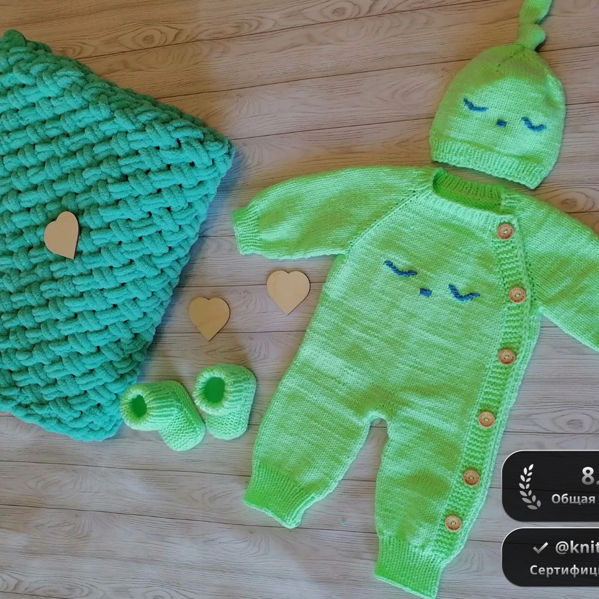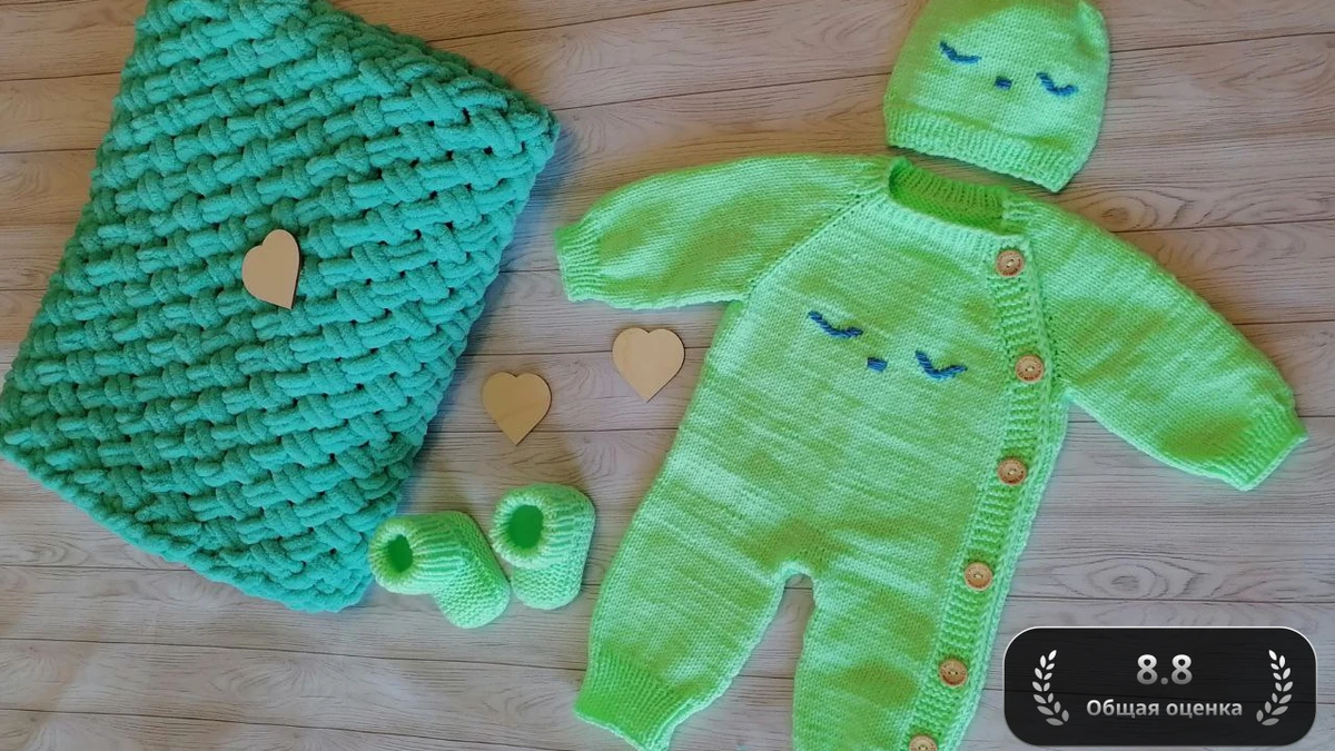 Очаровательный неоново-лаймовый комплект для малыша: плюшевый плед крупной ручной вязки, тёплый комбинезон регланом с боковой планкой на деревянных пуговках, шапочка с забавным узелком и «спящей» вышивкой глазок, а также миниатюрные пинетки-носочки. Мягкая полушерстяная пряжа для одежды дарит комфорт, а плюшевая пряжа пледа создаёт облачную текстуру. Комплект выглядит свежо и жизнерадостно, идеально подходит для фотосессий и первых прогулок.