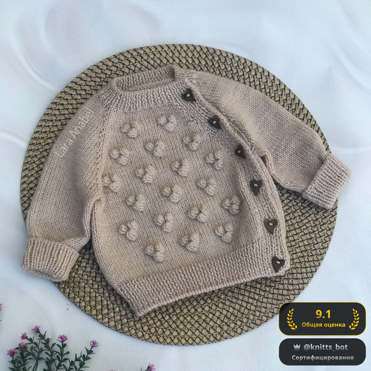Очаровательный бежевый детский свитер связан регланом сверху вниз и украшен целой россыпью объёмных бобов (шишечек) по передней части – смотрится словно тёплое облачко! Кнопочная планка сбоку на милых сердечках-пуговках облегчает переодевание малыша и добавляет трогательный акцент. Плотная эластичная резинка по горловине, манжетам и низу надёжно держит форму, а нежный оттенок «карамельное пралине» подчёркивает универсальность вещицы. Полотно выглядит ровным, петли аккуратные, а фото позволяет рассмотреть каждую шишечку – видно, сколько любви вложено в работу!
