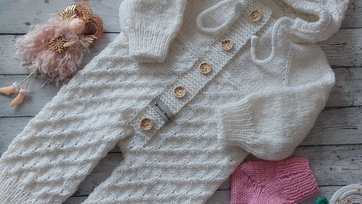 Этот очаровательный комплект включает в себя мягкий белый комбинезон с капюшоном и деревянными пуговицами, розовую вязаную шапочку и носочки. Каждый элемент тщательно выполнен с вниманием к деталям, создавая впечатление тепла и уюта. Использование разных текстур для комбинезона придаёт изделию живость и оригинальность, а цветовая палитра выглядит очень нежной.