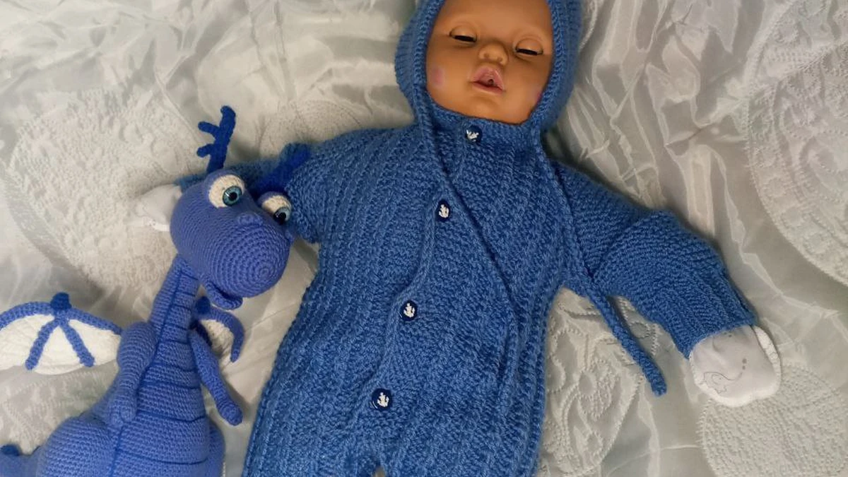На фото – очаровательный детский комбинезон с капюшоном насыщенного василькового оттенка и дружелюбный амигуруми-дракон в той же цветовой гамме. Комбинезон связан рельефными продольными дорожками, создающими приятную фактурность и дополнительную эластичность ткани. Манжеты, капюшон и планка оформлены аккуратной резинкой, а ряд пуговок-лапок придаёт игривый акцент и облегчает переодевание малыша. У дракончика объёмные крылья, хвостик и забавные рожки – отлично продуманная деталировка, подчёркивающая характер игрушки и идеально сочетающаяся с основным изделием.