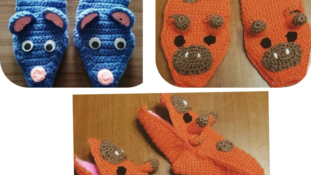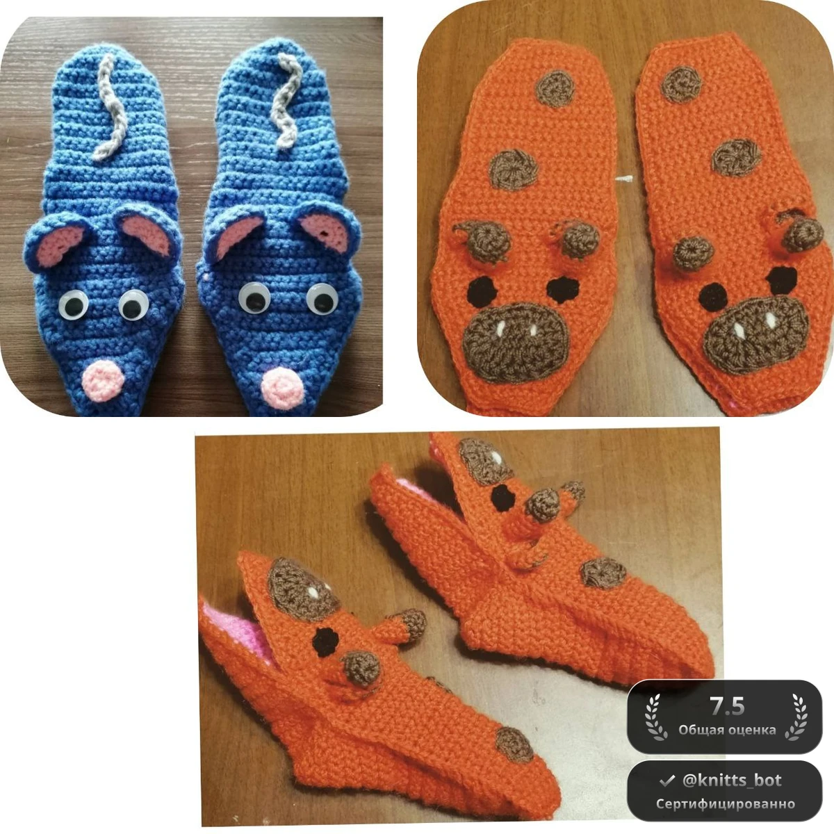 На фото – две пары детских тапочек-следков, связанных крючком: ярко-синие «мышки» с розовыми носиками, ушками и хвостиками, и весёлые оранжевые «дракончики/коровки» с коричневыми пятачками, пятнышками и зубками. Крупные клеевые глазки добавляют героям мультяшного шарма. Полотно ровное, плотное, без просветов, переходы цветов аккуратные. Форма следка удобна для стопы ребёнка, подъём достаточно высокий. Однако на оранжевой паре видны слегка неровные края и не совсем симметричное расположение деталей; фотография тёмновата и снята без раскрытия объёма изделия.