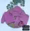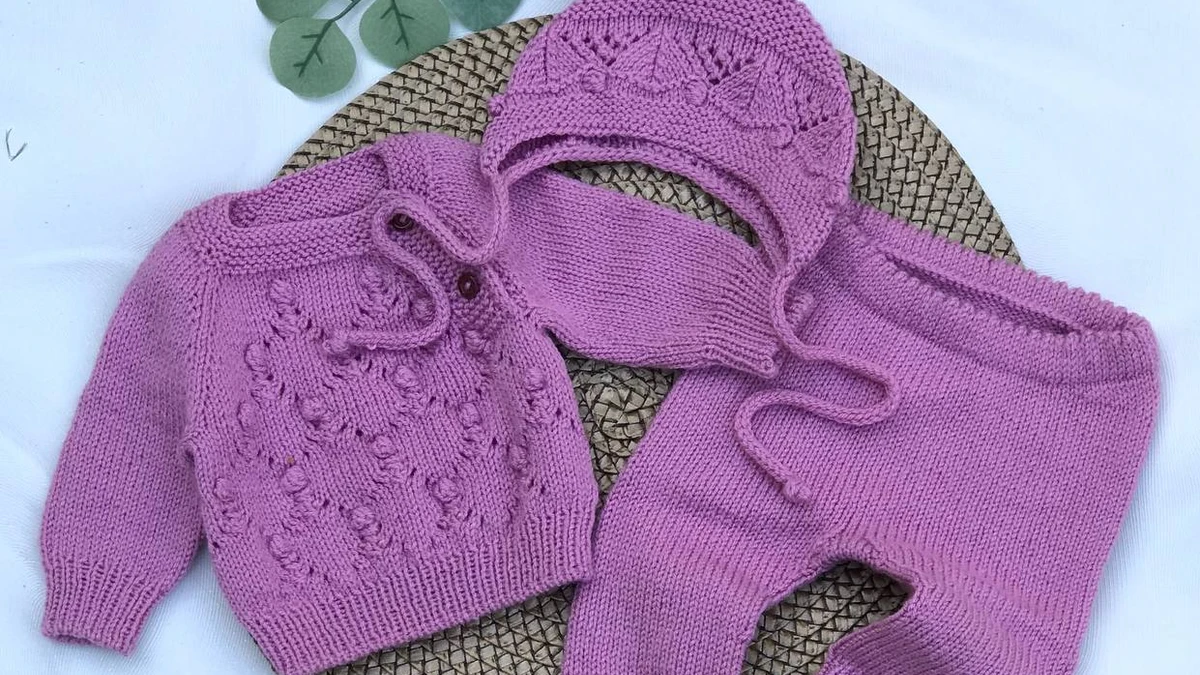 Милейший трёхпредметный комплект для малыша: реглан-свитер с ажурными «шишечками», шапочка-капор с листочками по краю и ползунки на кулиске. Ровная лицевая гладь и фактурные элементы образуют нежную, но выразительную игру текстур, а единый пудрово-сиреневый оттенок придаёт ансамблю цельность. Капор украшён аккуратной ай-корд завязкой, манжеты и низы связаны эластичной резинкой 1×1, что удобно для активного ребёнка. Фото чёткое, предметы разложены на контрастной циновке и фоне, декор из эвкалипта добавляет лёгкой эко-нотки.