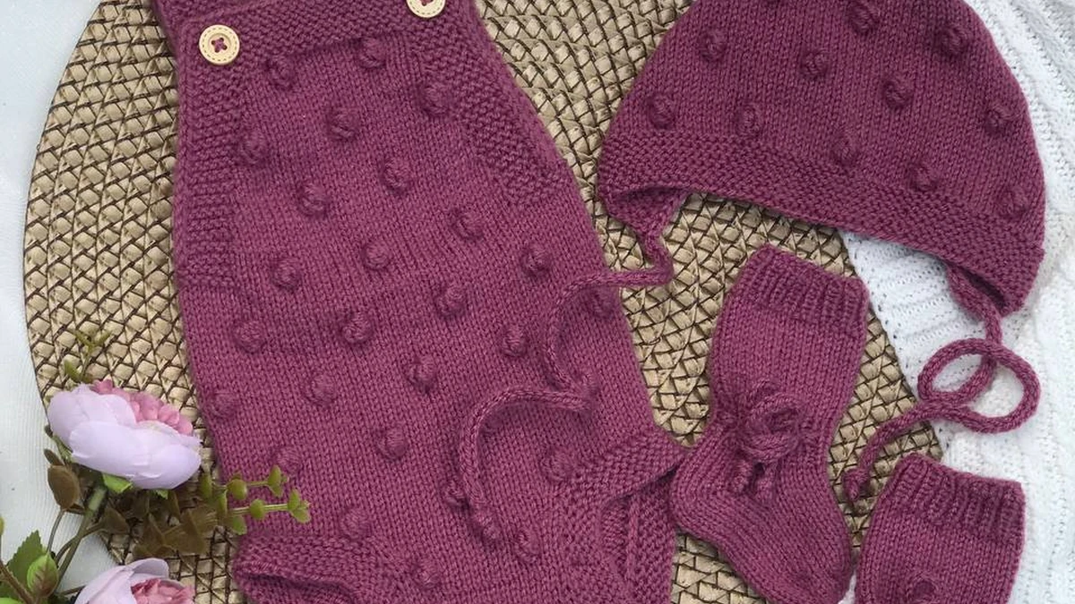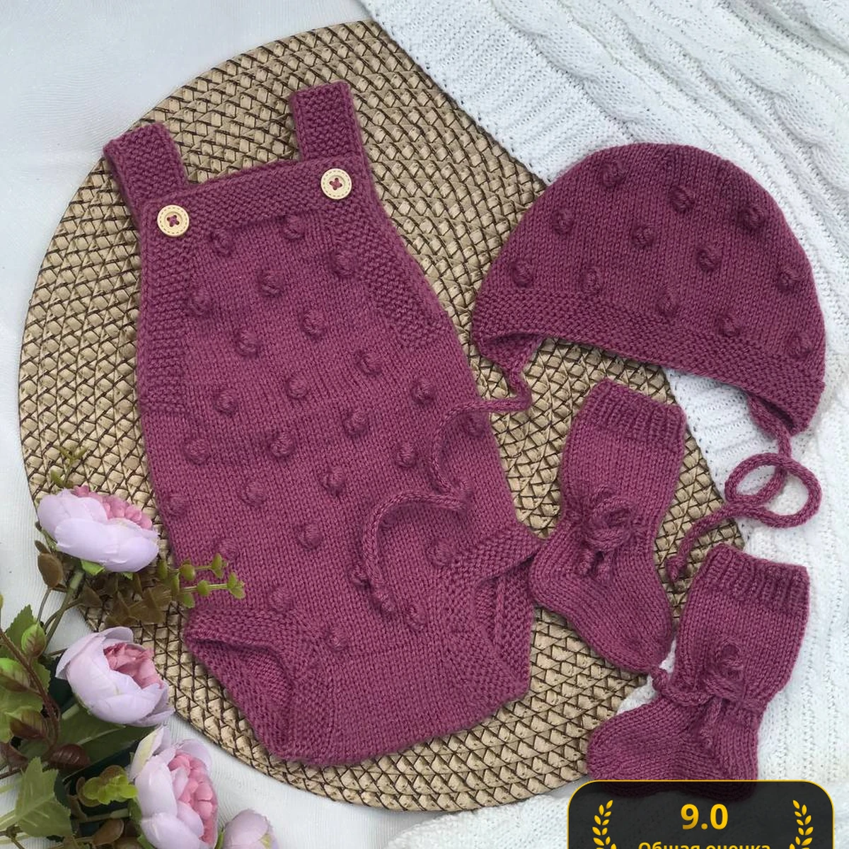 Очаровательный детский комплект в пыльно-розовом цвете состоит из цельновязанного боди-комбинезона с шишечками, уютного чепчика на завязках и тёплых пинеток. Ровное лицеевое полотно подчёркивает аккуратные объёмные шишечки, создавая милый ягодный рельеф. Плоские резинки на проймах и высокие планки лямок добавляют чёткости краям, а деревянные пуговицы придают природный акцент. Чепчик повторяет мотив шишечек и надёжно фиксируется мягкими шнурами-i-корд. Пинетки связаны круговыми рядами, украшены крошечной шишечкой и шнурком для фиксации. Вся троица смотрится гармонично и станет идеальным подарком для новорождённого.