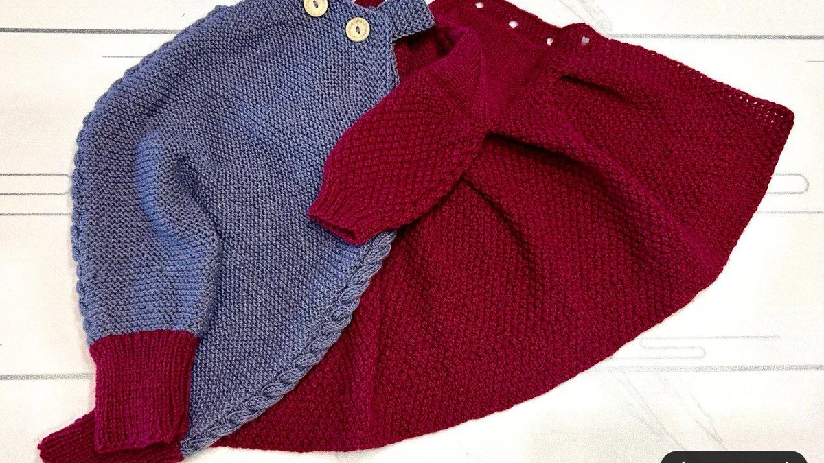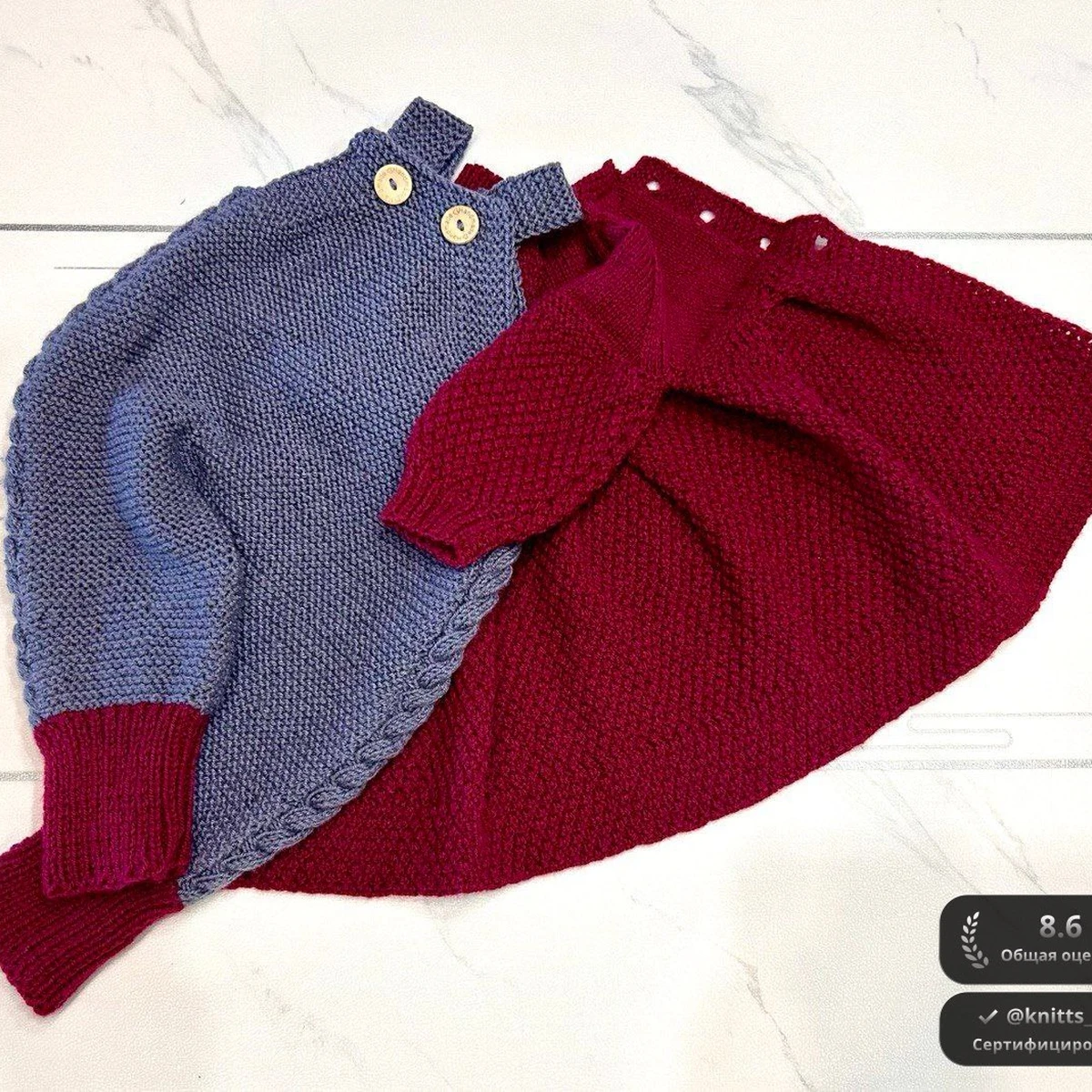 На фото представлена очаровательная детская одежда, состоящая из синего комбинезона и бордовой юбки. Комбинезон выполнен с использованием плотных текстур и украшен декоративными пуговицами, которые добавляют ему очарование. Юбка выполнена из бордовой пряжи, придавая наряду теплый и уютный вид. Эти изделия создают гармоничный образ, который понравится как детям, так и их родителям.