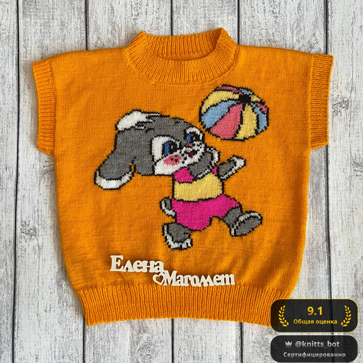 Очаровательный детский безрукавный пуловер, связанный гладкой лицевой гладью на насыщенном апельсиновом фоне. В центре – забавный серый зайчонок в малиново-жёлтом комбинезоне, ловящий яркий пляжный мяч. Интарсия выполнена аккуратно: чёткие контуры, ровные переходы цветов и выразительные глазки с розовыми щёчками придают персонажу живость. Плотная резинка 1×1 по горловине, проймам и низу создаёт аккуратную посадку и подчёркивает чистоту работы. Яркая палитра и мультяшный сюжет подарят ребёнку море радости и сделают вещь настоящей изюминкой гардероба.