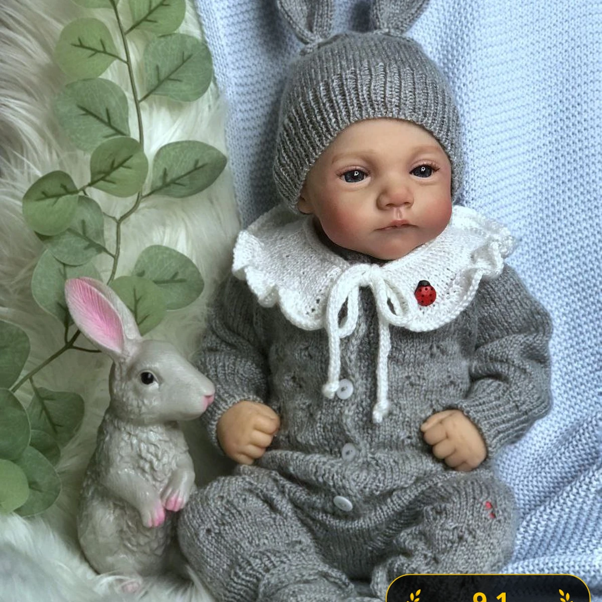 На фото очаровательный комплект для малыша: серый вязаный комбинезон с фактурными «косами»/аранскими дорожками и аккуратной планкой на пуговках, плюс шапочка-«зайка» с ушками. Посадка выглядит продуманной: манжеты и низ оформлены резинкой, полотно ровное, без явных перекосов. Отдельный акцент — белый ажурный воротничок (скорее крючком) со шнурочками-завязками и милой божьей коровкой. В кадре также игрушечный зайчик и декоративная зелень — очень нежная, «сканди» подача.