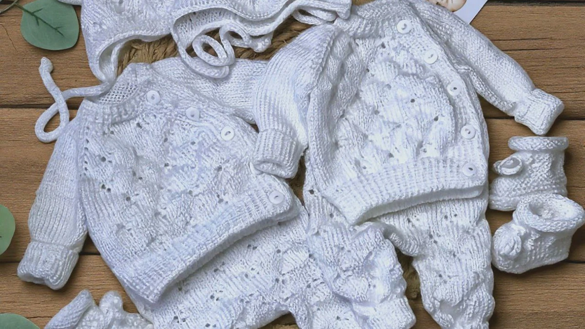 Судя по фактуре, это вязание спицами из тонкой детской пряжи. Кофточки выполнены лицевой гладью с ажурными раппортами (накид(ы) + убавления с наклоном), что даёт лёгкую «дышащую» структуру и аккуратные отверстия по рисунку. По низу, манжетам и горловине/краям — резинка 1×1 или 2×2 для упругости и посадки. Планки под пуговицы связаны отдельными полосами (либо поднятием петель по краю) с формированием отверстий под пуговицы (накид/закрытие 1–2 петель с последующим набором). Втачной рукав или реглан визуально не читается на 100%, но обработка проймы выглядит чистой — без грубых ступенек. Штанишки связаны по кругу или с боковым швом: видно равномерные прибавки/убавки для объёма, манжеты на резинке и пояс со шнурком/кулиской. Чепчики/капоры сформированы укороченными рядами (или клиньями) для анатомической посадки, завязки — шнур/i-cord. Ушки «зайчика» вывязаны отдельно и пришиты потайным швом, края выглядят сглаженными — вероятно, обвязка крючком или аккуратный подшив/кеттлёвка. Пинетки — классическая конструкция с подошвой и подъёмом, с убавками по мысу для округлой формы.
