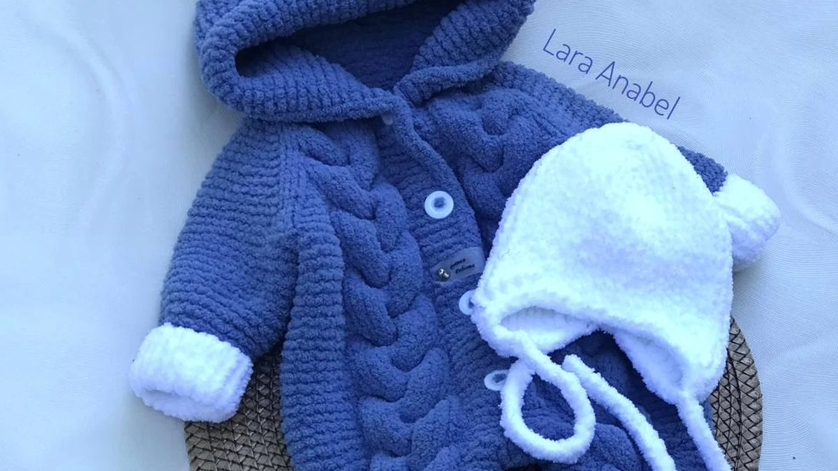Комбинезон и шапочка выполнены техникой вязания спицами. Для выполнения узора 'косы' использовалось перекрещивание петель с помощью дополнительной спицы, что придает изделию объем и текстуру. Основная часть выполнена из плюшевой пряжи, что делает её невероятно мягкой и тёплой. Шапочка вяжется аналогично и подходит по цвету и текстуре к комбинезону. Капюшон имеет форму с ушками, в которых использовано контрастное вплетение белого и синего цветов для имитации заячьих ушек. Все элементы тщательно проработаны, чтобы обеспечить гармоничное сочетание как текстуры, так и цветовой палитры изделия. Вязание петель велось с учетом плотности, что позволило получить ровные ряды и аккуратное изделие без видимых швов. Закреплены швы специальными методами для предотвращения растягивания и сохранения формы изделия.