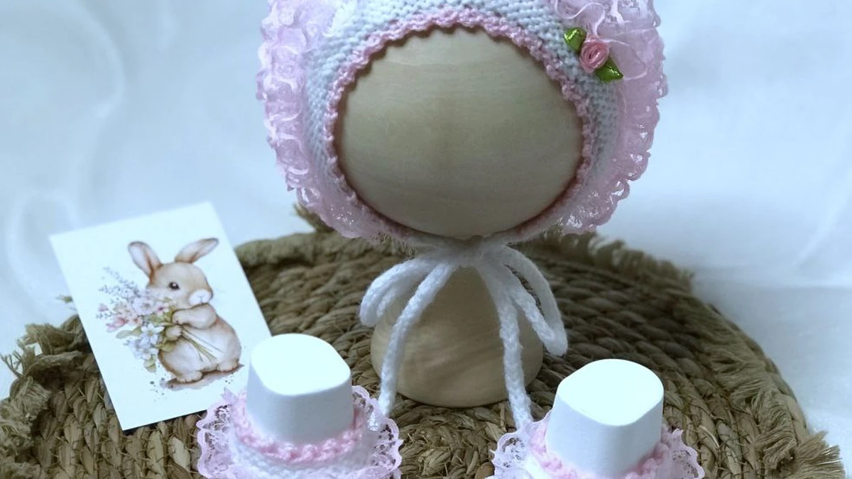 Комплект выполнен преимущественно спицами, с декоративной отделкой по краю. Полотно чепчика связано ровными рядами с упругой, стабильной структурой: для такого эффекта чаще всего используют платочную вязку (все ряды лицевыми) либо чередование лицевых/изнаночных рядов для формирования гладкой поверхности. Макушка формируется постепенными убавками: петли делят на клинья и закрывают с нужным наклоном, чтобы купол получился округлым без «уголков». Линия лица аккуратно оформлена кромкой: это может быть несколько рядов платочной вязки или тонкая планка, после чего по краю крепится отделка. Завязки выполнены отдельным элементом — простым вязаным шнуром (например, «гусеничка» крючком или шнур I-cord спицами), затем пришиты к планке. Пинетки связаны классической конструкцией: подошва (платочкой/лицевой гладью) с прибавками по носику, затем подъём и боковины с формированием мыска убавками. Манжета оформлена мягкой окантовкой и декоративной рюшей. Рюши выглядят как пряжа с готовой оборкой либо как обвязка крючком по краю: сначала закрепляющий ряд, затем «волан» за счёт частых прибавок. Мини‑розочки и листики выполнены отдельно (чаще крючком) и аккуратно пришиты потайными стежками.