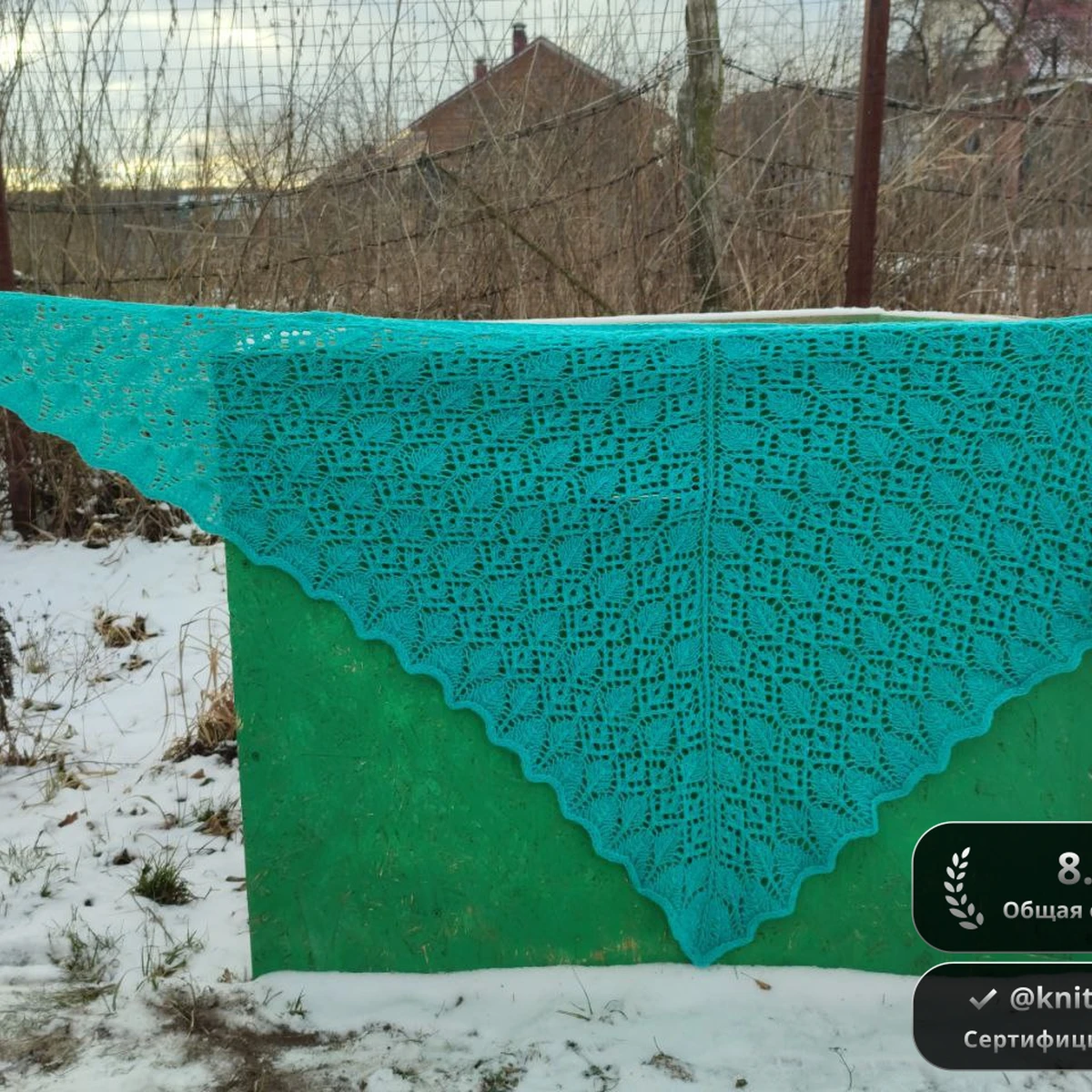 Это великолепная вязаная шаль в ярко-бирюзовом цвете, которая моментально привлекает внимание своим изысканным кружевным узором. Шаль выполнена в технике ажурного вязания, что позволяет ей быть очень легкой и воздушной, идеально подходящей как для повседневного использования, так и для особых случаев. Узор здесь напоминает переплетающиеся листья, что добавляет изделию особого шарма и элегантности.