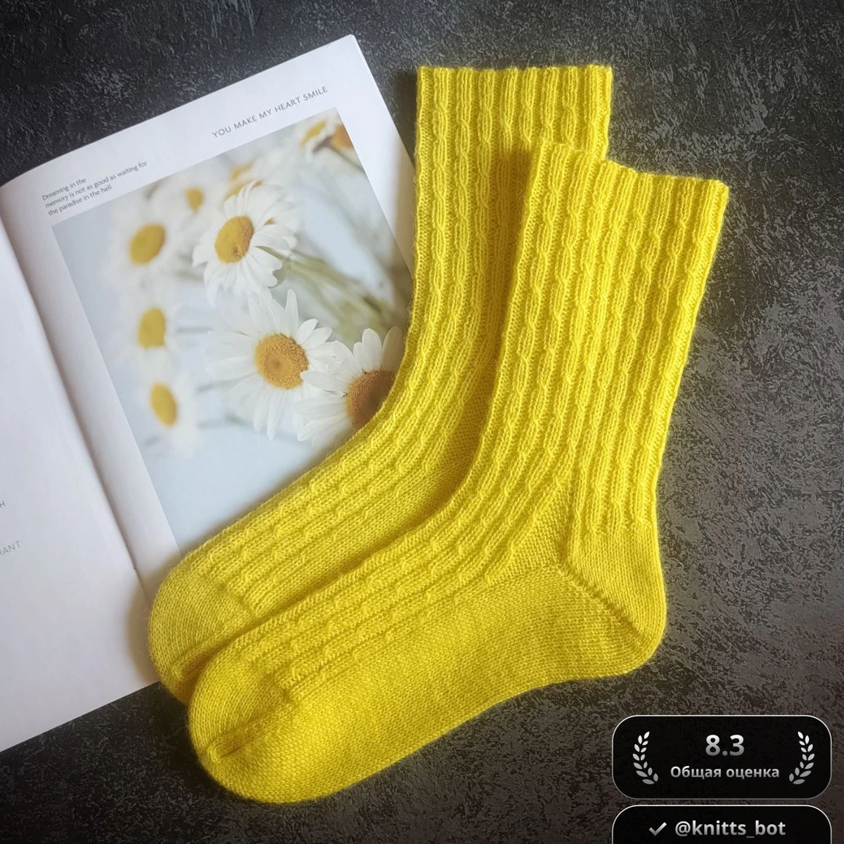 Пара ярко-лимонных носков сразу поднимает настроение: насыщенный жёлтый оттенок сияет словно солнечный луч, а аккуратный рельефный узор из мини-жгутов создаёт деликатную текстуру. Высокая резинка плавно переходит в ровное полотно стопы, подчёркивая анатомический силуэт пятки и мыска. Тончайшая пряжа, идеальная плотность и почти невидимые переходы в местах убавок говорят о внимании к деталям. Фото с ромашками лишь усиливает весенний, по-доброму оптимистичный характер изделия.
