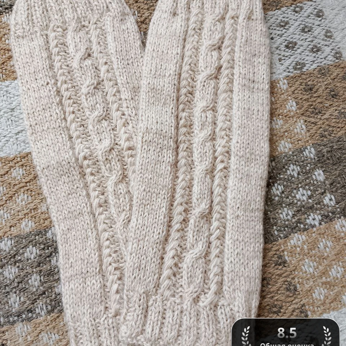 - Пряжа: шерсть с акрилом, мягкая, кремового цвета, около 200 грамм.
