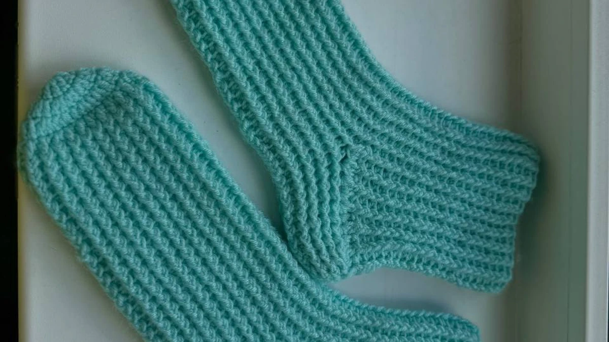 На фотографии изображены связанные носки мятного цвета. Они выглядят уютно и аккуратно выполнены. Простой, но привлекательный дизайн делает их идеальным выбором для холодных дней. Задумка с использованием одного цвета достаточно традиционна, однако это придаёт носкам универсальность.