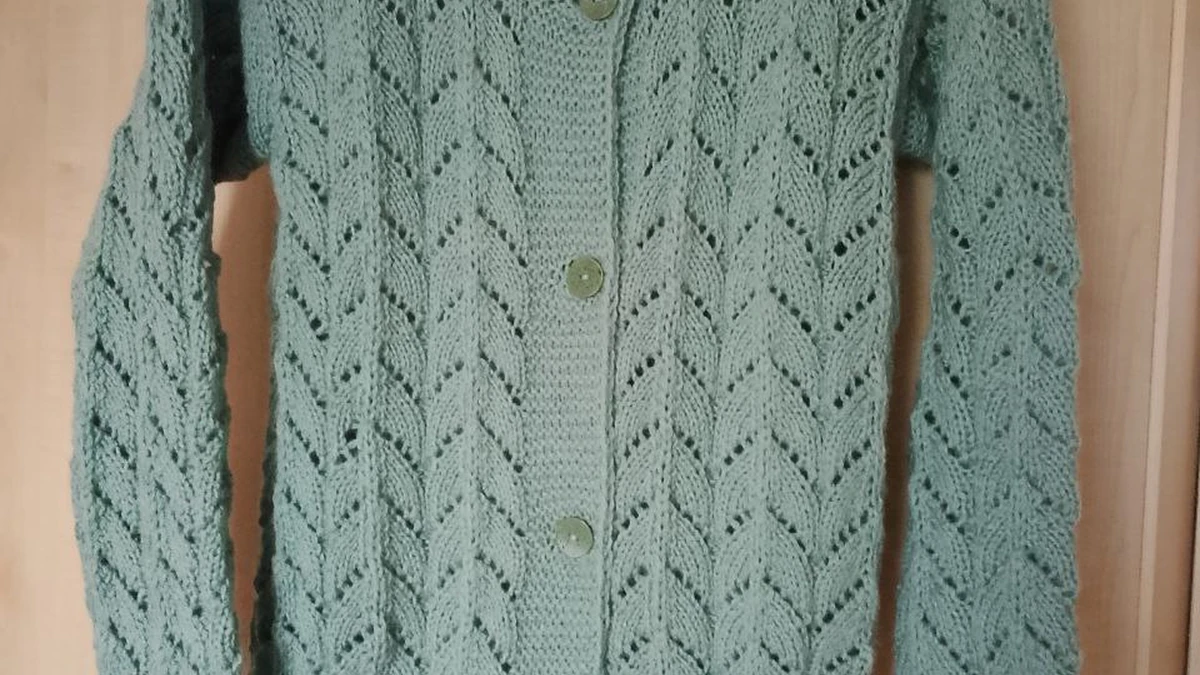 Перед нами изящный удлинённый кардиган нежного мятного оттенка, связанный спицами из лёгкой полушерстяной пряжи. Основной узор – вертикальные «ёлочки»-листья с ажурными отверстиями, создающими красивый рельеф и визуально вытягивающими силуэт. Широкая планка застёжки выполнена платочной вязкой, подчёркивая аккуратные матовые пуговицы в тон. Скруглённый вырез горловины мягко обрамляет шею, а рукава повторяют узор полочек, обеспечивая гармонию рисунка по всему изделию. Длина до середины бедра делает эту вещь универсальной – её легко представить и с джинсами, и с платьем. Работа выглядит аккуратной, петли ровные, переходы узора чёткие, а выбранный цвет подчёркивает свежесть и лёгкость модели.