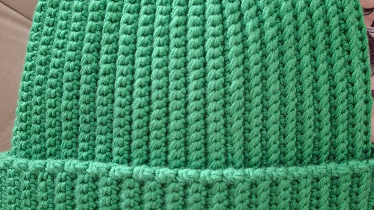 Уютная зелёная шапка-бинни выполнена плотной рубчиковой фактурой: вертикальные дорожки выглядят ровно и аккуратно, а одинаковая плотность петель создаёт гладкий, «тушки» силуэт. Сглаженные убавки на макушке собирают полотно в аккуратную звёздочку, а широкий отворот добавляет объёма и тепла. Яркий однотонный цвет напоминает сочную весеннюю мяту — он освежает и отлично подчёркивает текстуру. Фото достаточно чёткое: хорошо видны петли и структура, что позволяет оценить мастерство автора.