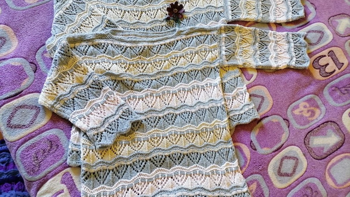 Нежный ажурный джемпер в спокойной природной гамме — серо-голубой, молочный и беж — выглядит лёгким и «воздушным». Ритм полос подчёркнут волнистой структурой и ажурными дорожками, из-за чего полотно играет фактурой даже без аксессуаров. Идея удачная и носибельная, узор достаточно трудоёмкий. По качеству видно уверенную работу, но изделию не хватает финальной «полировки»: лёгкая неразглаженность и отсутствие явной ВТО/блокировки съедают часть аккуратности, а фон фото отвлекает от красоты узора.