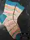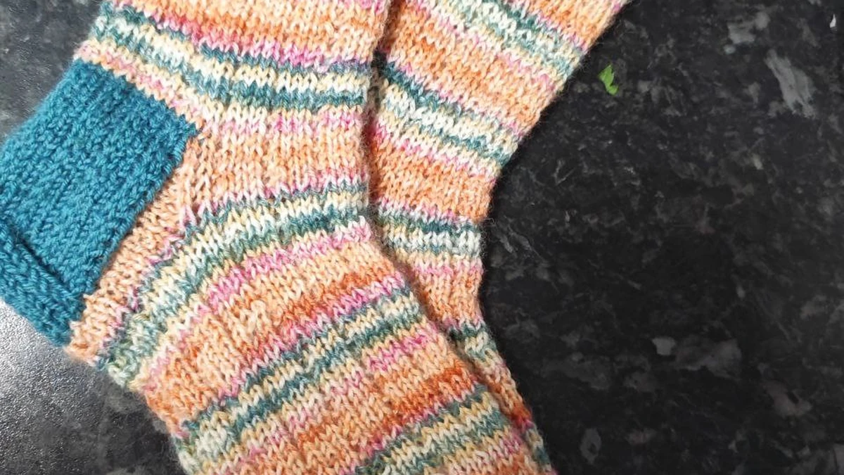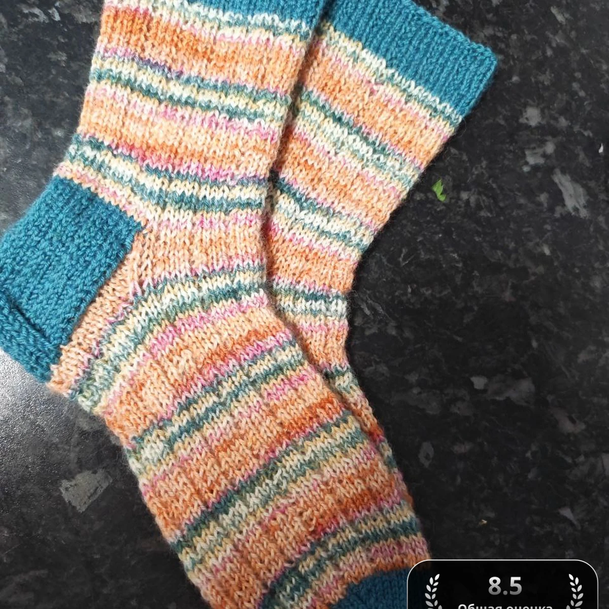 Пара уютных носков в ярко-бирюзовой окантовке, связанная классическим способом по кругу. Самострипинг пряжа создаёт игривые полоски абрикосового, зелёного и розового оттенков, а контрастные носок, пятка и манжета подчёркивают форму. Петли выглядят ровно, резинка держит форму, пятка усилена более плотной вязкой – отличный выбор для долговечности. Фото хорошо передаёт фактуру меланжевой нити, цветовая гамма гармонична и поднимает настроение.