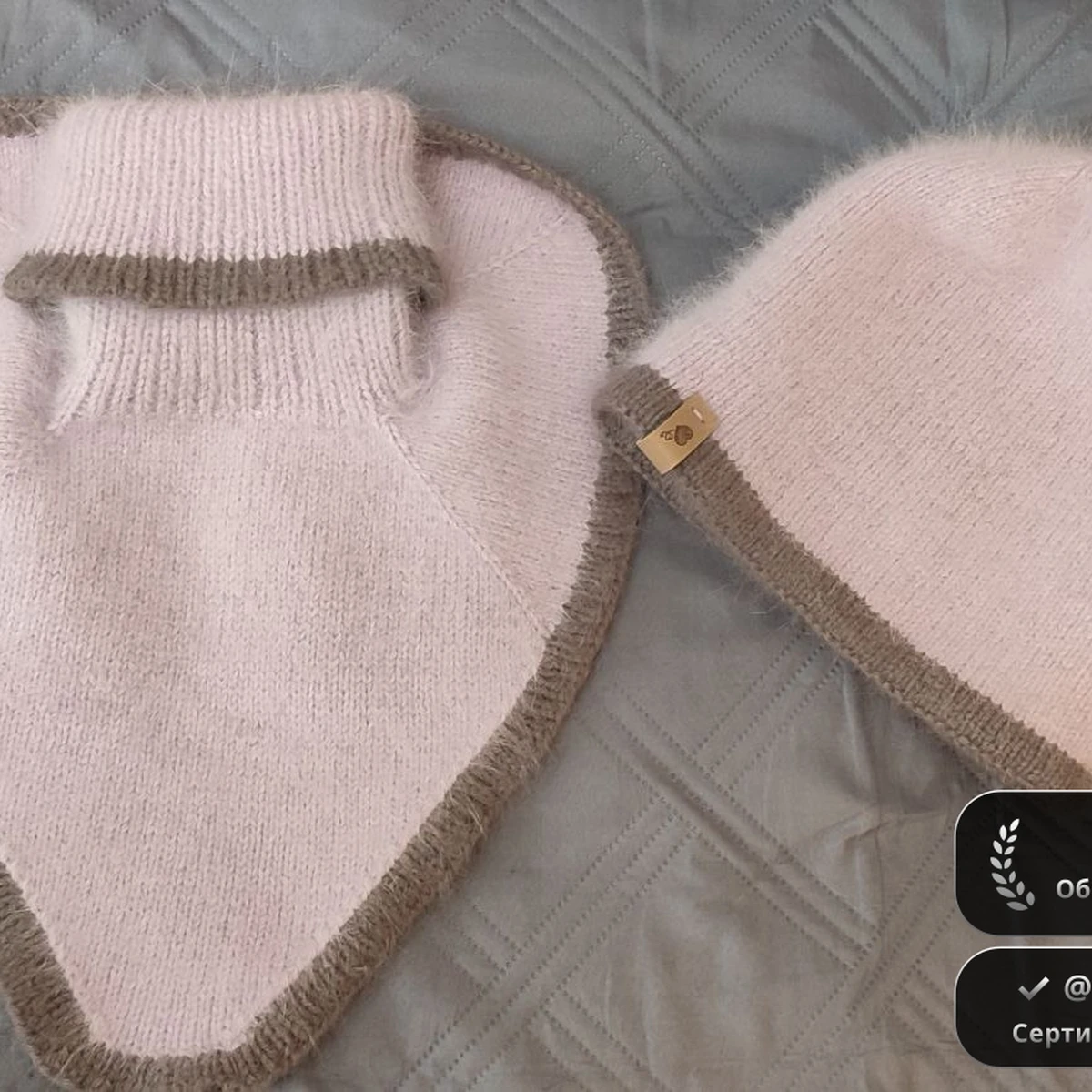 Очаровательный зимний комплект – анатомическая манишка-платок и облегающая шапочка-бини – связан из пушистого пудрово-розового мохера с контрастной какаовой окантовкой. Манишка вывязана сверху-вниз регланом, благодаря чему аккуратно садится на плечи и шею, а мягкая воротничковая резинка 2×2 добавляет уюта. Шапочка выполнена по классической формуле с незаметными убавками по четырём клиньям, что создаёт ровный купол без складок. Оба изделия получились лёгкими как облачко, при этом хорошо держат тепло: дуэт шёлкового кид-мохера и тонкой мериносовой нити даёт деликатный «ореол» и бархатистую посадку. Комплект смотрится минималистично и стильно, отлично подойдёт к пальто пастельных или нейтральных оттенков.