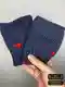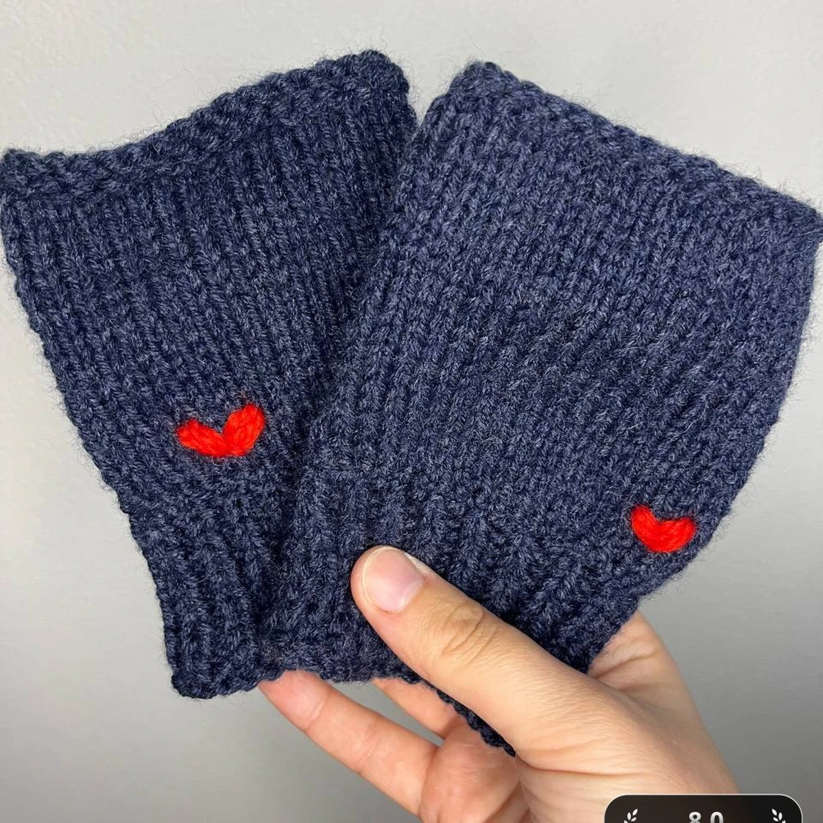 На фото изображены стильные вязаные митенки темно-синего цвета с очаровательными маленькими красными сердечками внизу, добавляющими им игривый акцент. Эти митенки аккуратны и практичны для прохладной погоды, сохраняя руки в тепле. Простой, но элегантный дизайн делает их подходящими для повседневного использования.