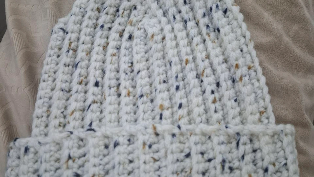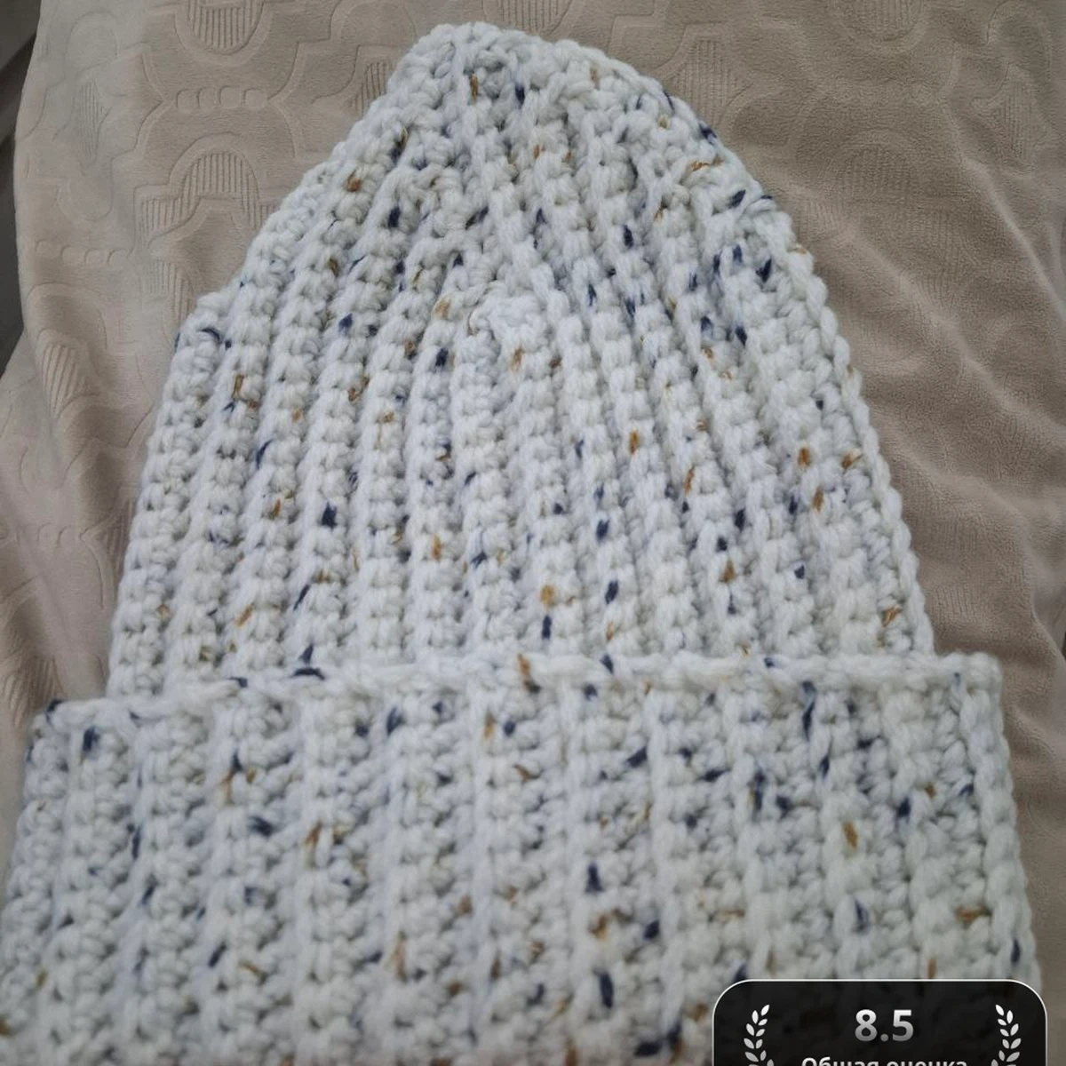 Милая рельефная бини, выполненная крючком из белой твидовой пряжи с вкраплениями тёмно-синих и охристых точек. Чёткие вертикальные рубчики создают упругую резинку, отворот красиво подчёркивает фактуру и добавляет тепла. От верха шапочки до линии отворота виден аккуратный переход убавок – макушка собирается в звёздочку. Цветовые крапинки оживляют нейтральную базу и делают модель универсальной: подойдёт как к яркой, так и к спокойной верхней одежде. Работа выглядит уютной, выполнена из толстой, мягкой пряжи – отличный вариант на позднюю осень или зиму.